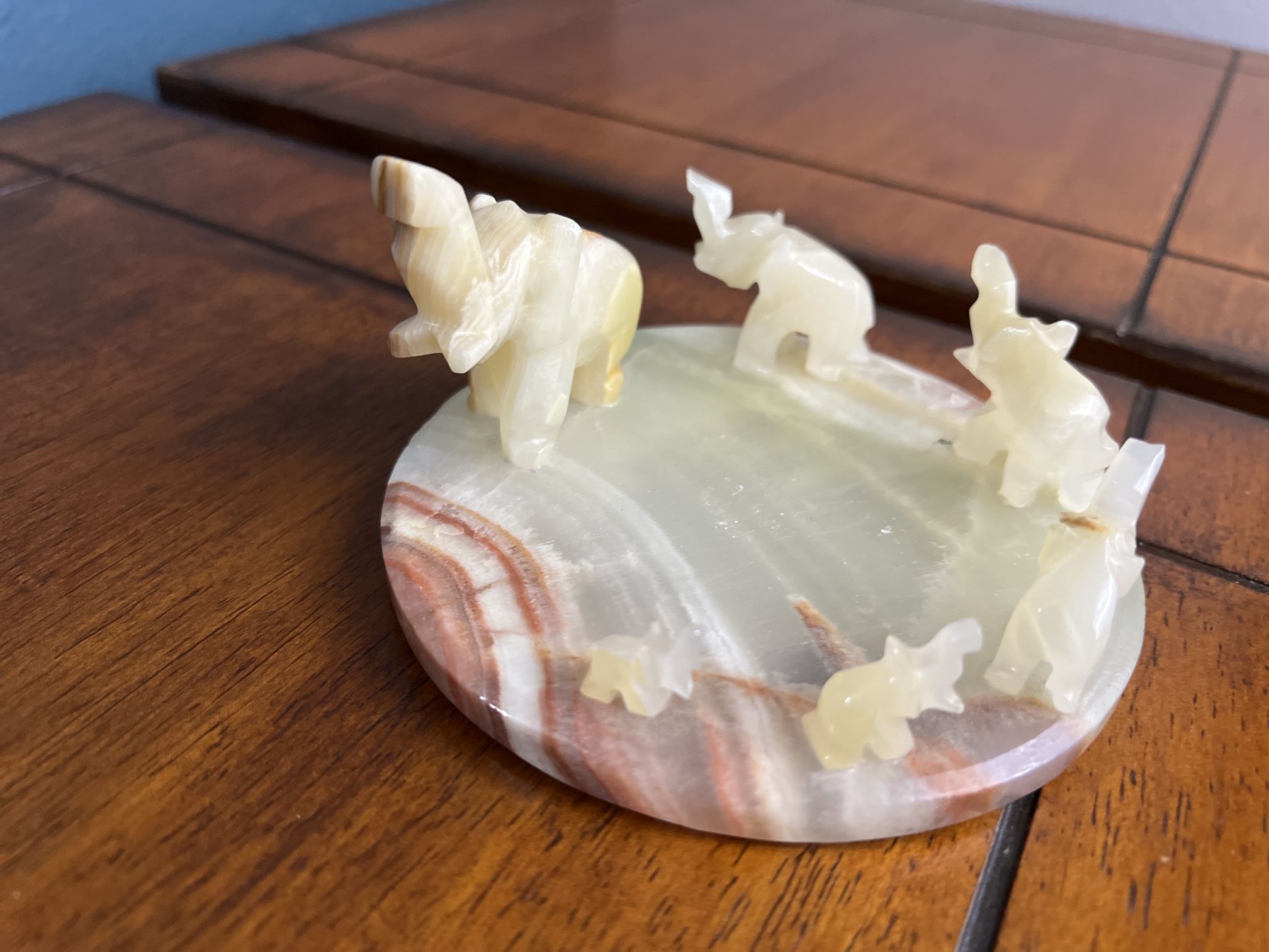 Check out this marvel stone Elephant decor piece with 6 elephants going in circle. See pictures and video for details. Vintage decors are sold as is, no cracks, no visible damage. Let me know if you have any questions.