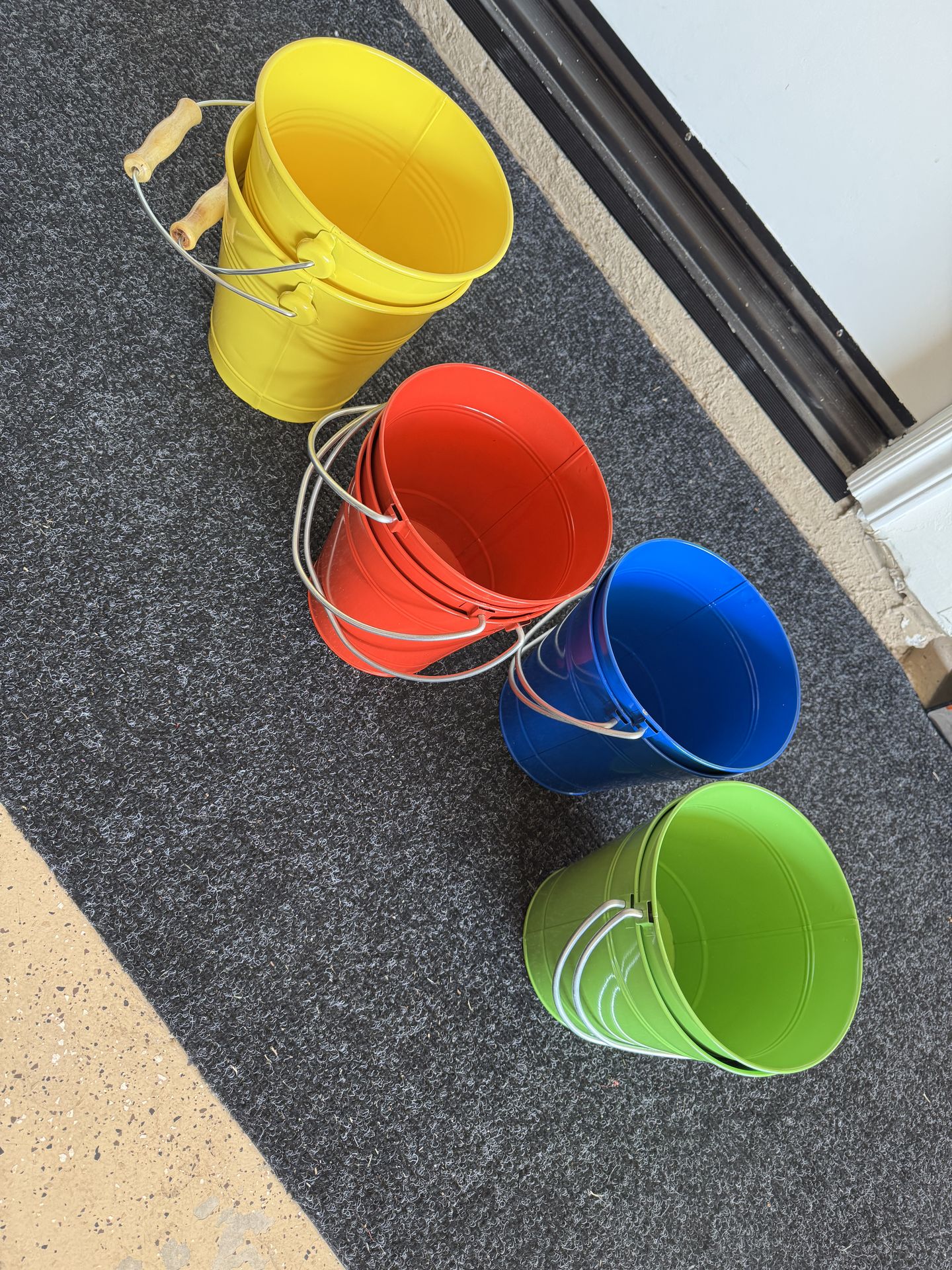 Excellent condition. See pictures. Only yellow pails have the wooden handle. Yellow pails are slightly larger. The red green and blue pails are 7.5 x 8.5” Purchased from Land of Nod (Crate and Barrel)