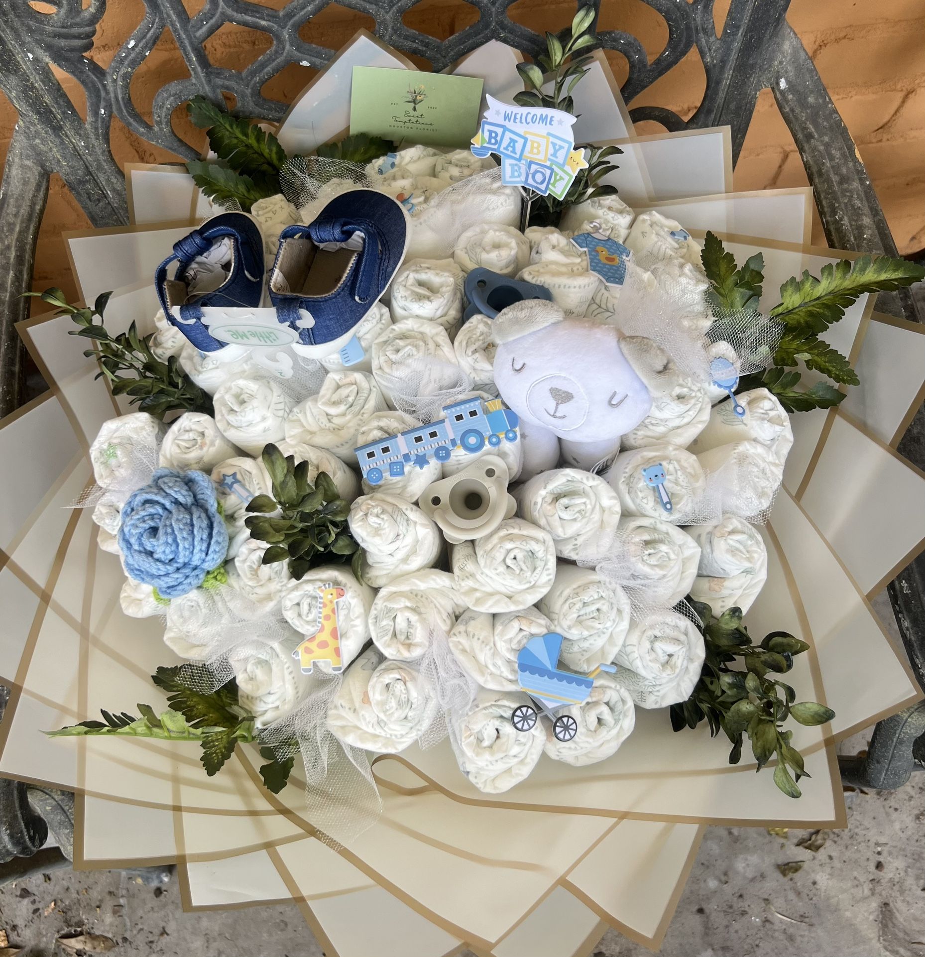 Baby diaper bouquet for boy or girl price varies depending how many diapers, add ons such as clothes, shoes, etc. Ramo de pañales para bebé niño o niña precio varea dependiendo la cantidad de pañales y cosas para bebé.