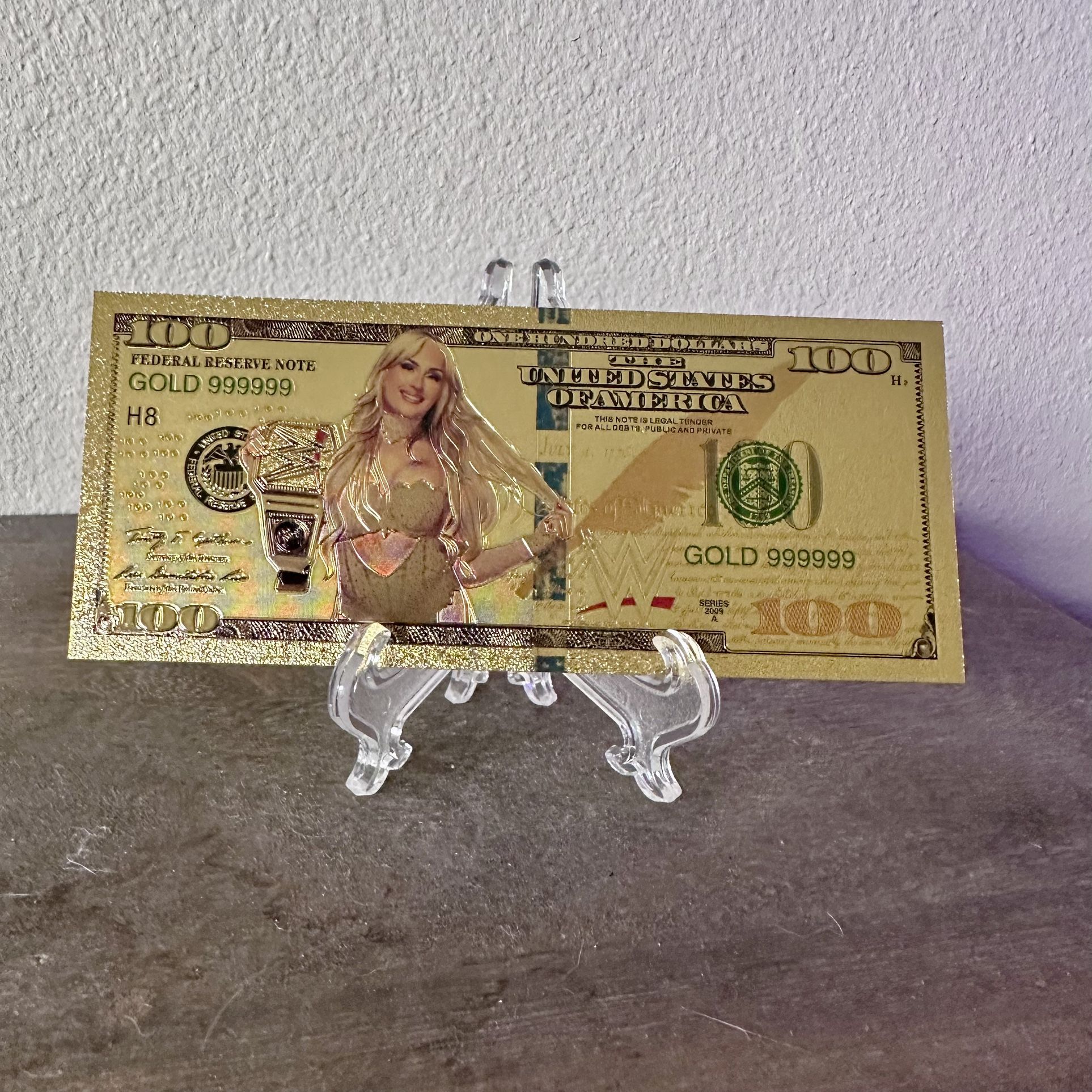 24k Gold Foil Plated Tiffany Stratton WWE Wrestler Banknote (Additional styles available) (Not real currency) Includes 1 Banknote- last photo shows additional styles available Amazing quality! Pictures do not do these justice, what you see in person is amazing! So much detail and shine in each one. You will be very happy with what you see. Stands not included Great gift for any collector or wrestling fan! Unique gift. Great stocking stuffer. Perfect for birthdays/baby showers/Christmas/Graduation and more! View my page for many more options and tons of characters and styles. Will bundle! Most orders ship same or next day!