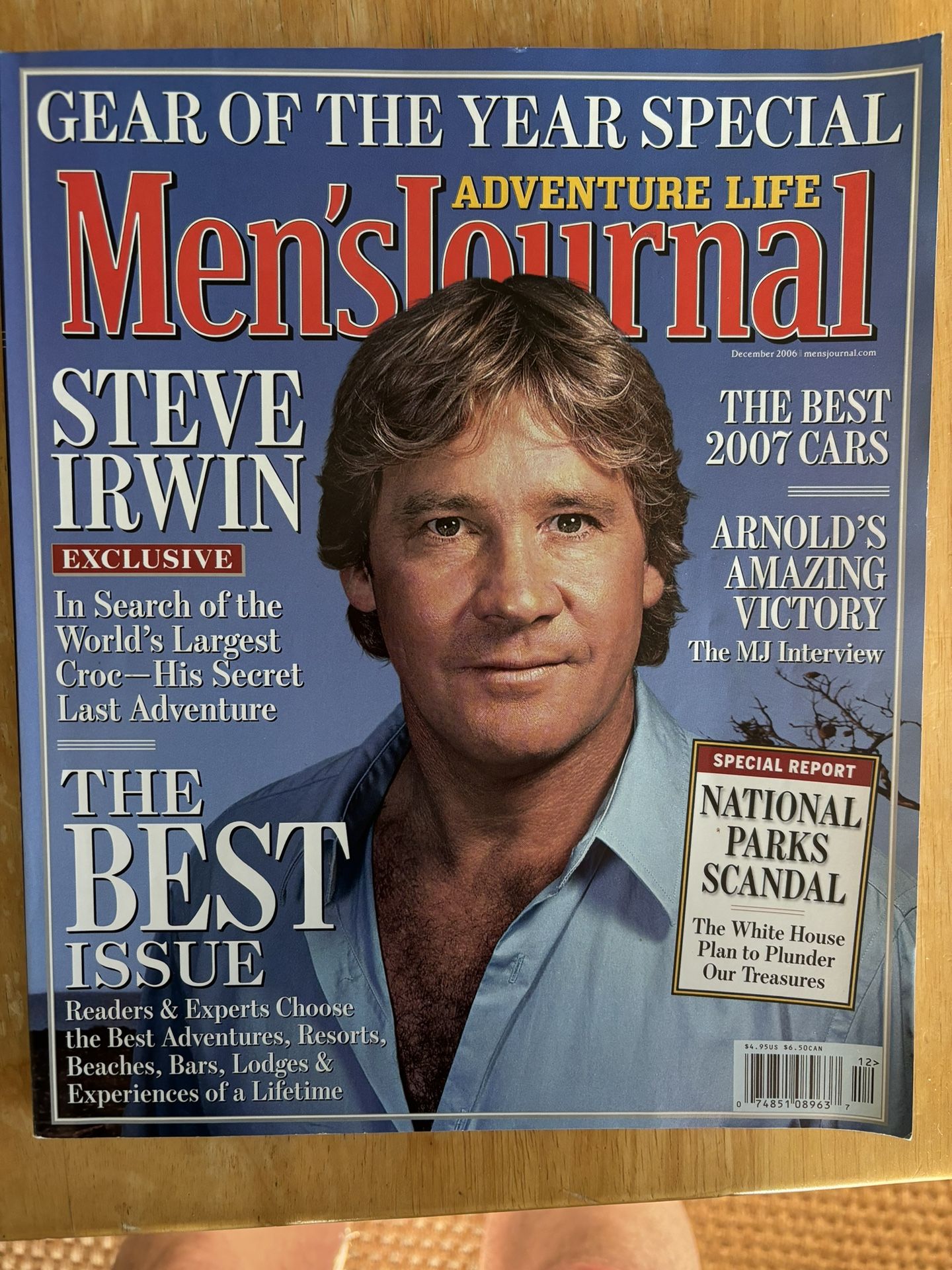 Men's Journal magazine from December 2006 featuring a beautiful front cover of Steve Irwin! The magazine is in very good. This magazine is a great addition to any collection and is a nice way to reminisce.