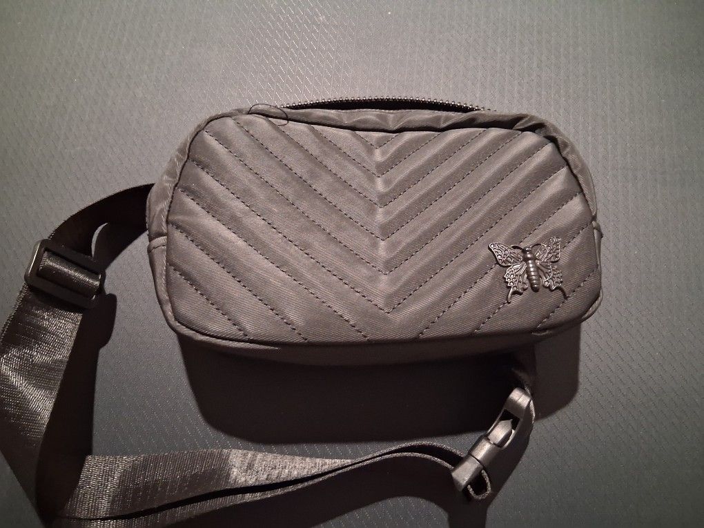 A rarely used medium sized black fanny pack with a simple butterfly. One main pocket with a small side pocket and adjustable strap the can be buckled.
