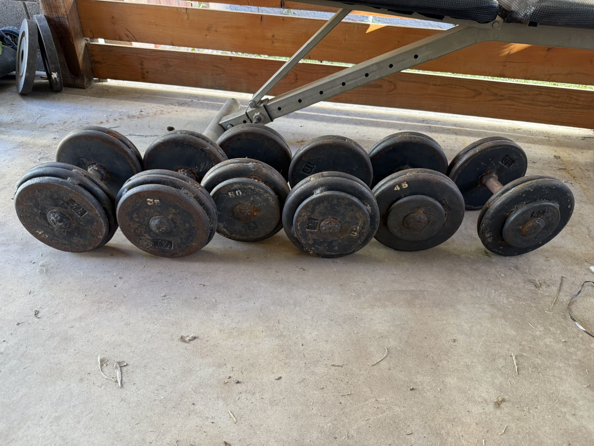 Vintage Iron Dumbbell Set – 45–55 lb. 300lbs. Selling for .50 cents / lb. Firm. Selling a vintage iron dumbbell set ranging from 45 lb to 55 lb. These are the classic old-school style dumbbells—solid, no-nonsense, and built to last. Perfect for a home gym, garage gym, or anyone who appreciates durable iron equipment. Includes: • (2) 45 lb dumbbells • (2) 50 lb dumbbells • (2) 55 lb dumbbells • Total: 6 dumbbells / 300 lbs Condition: • Excellent structural condition • Classic iron patina • Fully functional and balanced • No cracks or damage Great for heavy rows, presses, carries, and anyone looking to add serious weight without modern rubber or adjustable systems. Price: $150. Firm. FCFS and pickup is on Country Club and Brown in Mesa. Message me if interested