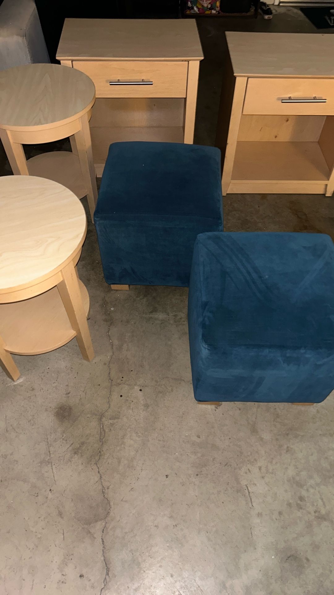 2 Navy blue chairs. 2 side tables. 2 bedside drawers $25 each $150 for whole set
