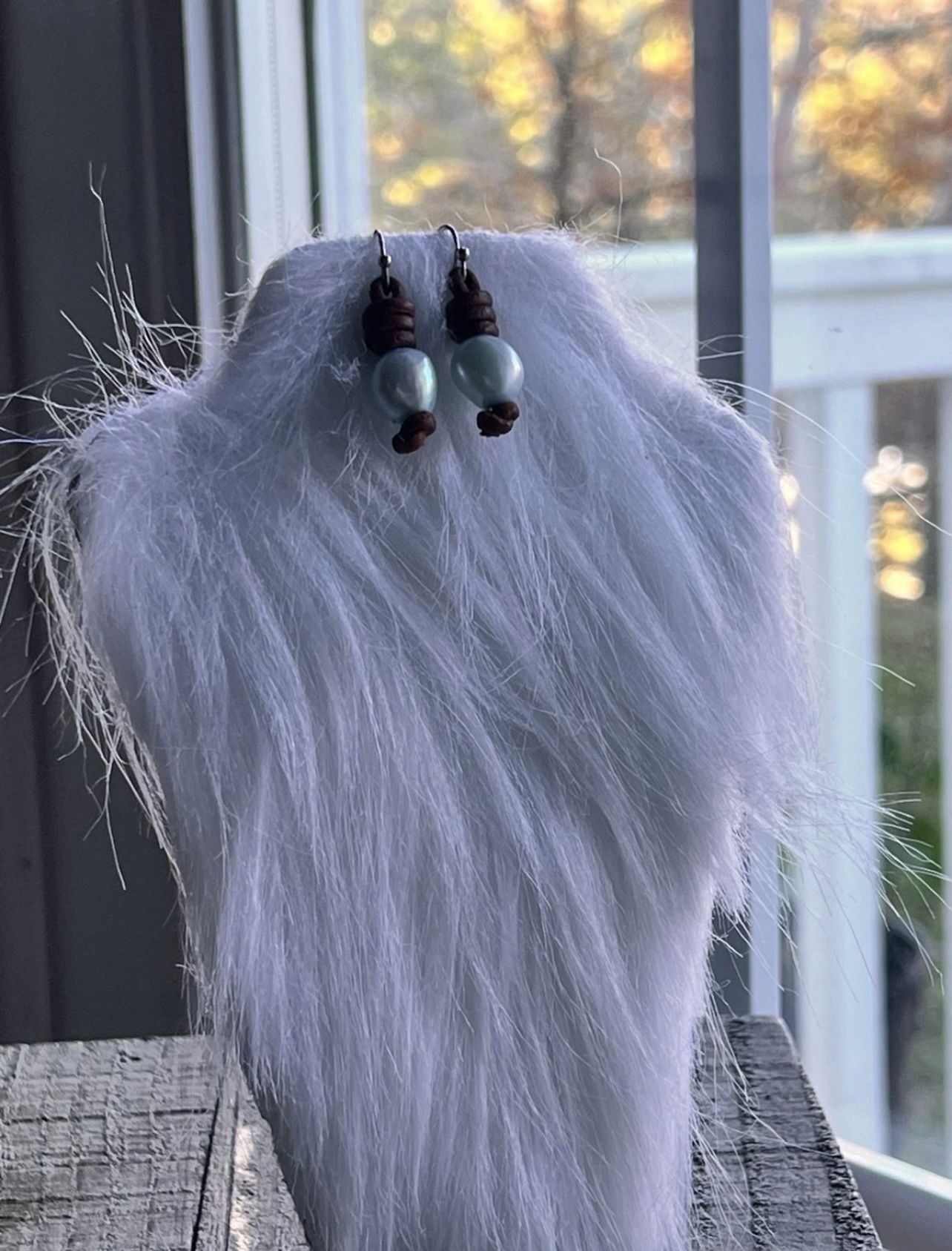 Light blue freshwater pearls earrings and dangle brown leather with 925 sterling silver hooks