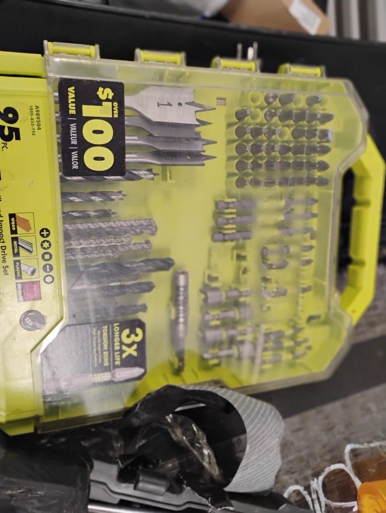 This is a Ryobi 95-Piece Drill and Impact Drive Kit. Helpful Information: Variety of Bits: This kit includes a wide assortment of drill bits and driving bits suitable for various materials like wood, metal, plastic, brick, block, concrete, and mortar. Durability: The black oxide-coated drill bits offer increased durability, and the impact-rated drive bits feature a "Torsion Zone" for 3X longer life. 135° Split Point: The drill bits have a 135° split point to prevent walking and ensure accurate drilling. Organized Case: The kit comes in a convenient case for easy storage and organization of the bits
