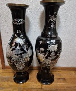 Mother Of Pearl Black Lacquer Asian Vases And Stands (Please Read Description Below)$50Steilacoom, WA