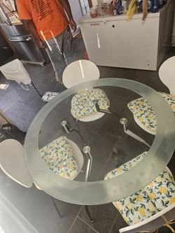 Glass dining table with 4 chairsStylish round glass dining table. Has a cool frosted edge and sturdy metal base. Comes with 4 white chairs. $120Piedmont, SC