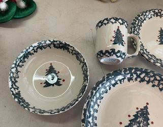 Christmas Dinnerware, Plus Glassware, “Tienshan Green Sponge Winter Wonderland Green Pine Tree With Red Dots Plates$30Carlsbad, CA