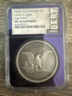 2026 2oz Ascension Liberty & Eagle High Relief Traderbea - MS70 ANTIQUED$500Lakeside, CA