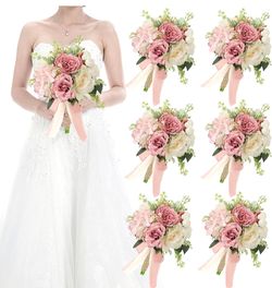 Set of 6 Wedding Bridesmaid Bouquets - 7 Inch Artificial Flowers Bouquets for Ceremony Anniversary Centerpieces Decorations - Pink & White$55Long Beach, CA