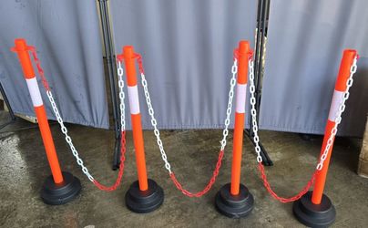 [4 Pack] 34 inch Traffic Delineator Post with Weighted Base, Orange Safety Cones with 5 FT Plastic Chain, Safety Barriers with Reflective Collar for $30Carson, CA