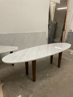 Oval White Carrara Marble Table With Brown Stained Legs Made Of Wood $1,500West Hollywood, CA