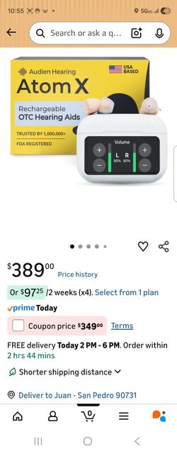 Audien Atom X Hearing Aid For Seniors & Adults with Hearing Loss - Noise Cancelling, Rechargeable OTC Bluetooth Hearing Aids w/Charging Case, 48+ Hour$200San Pedro, CA