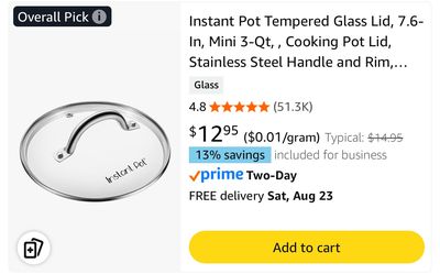 Instant Pot Tempered Glass Lid, 7.6-In, Mini 3-Qt, , Cooking Pot Lid, Stainless Steel Handle and Rim, Clear$6Las Vegas, NV