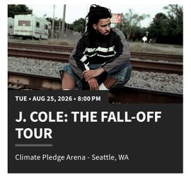 J. Cole The Fall-Off Tour Seattle, WA 8/25/26 - 2 Tickets$700Federal Way, WA