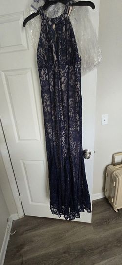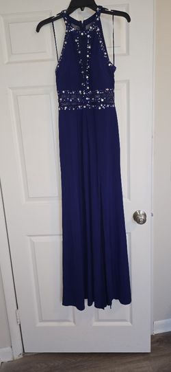 This is a Morgan & Co. navy blue halter-style evening gown with a rhinestone-embellished bodice and $80Jacksonville, FL