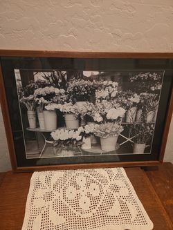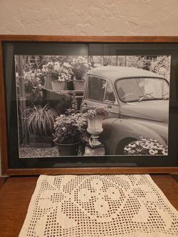 framed black and white photograph of a vintage truck decorated with flowers and plants,$10Goodyear, AZ