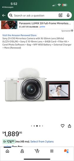 Sony ZV-E10 Mirrorless Camera with 16-50mm Lens (White) (ILCZV-E10L/W) + Sony E 10-18mm Lens + 64GB Card + Filter Kit + Corel Photo Software + Bag + N$1,300San Bruno, CA