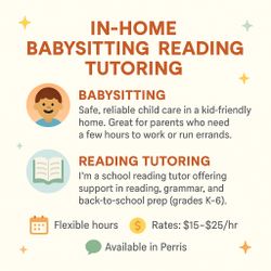 🧒 Babysitting & Reading Tutoring – Perris Area$0Perris, CA