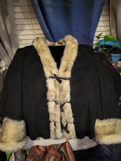 Womens black suede jacket with a beige fur trim and toggle closures.$40Westport, WA