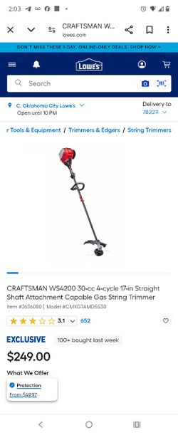 CRAFTSMAN WS4200 30-cc 4-cycle 17-in Straight Shaft Attachment Capable Gas Weed Eater$140San Antonio, TX
