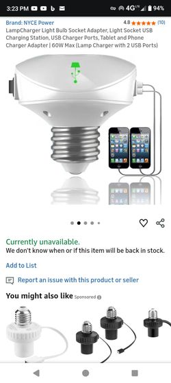 Lampcharger Light Socket USB Power Adapter 2 USB Ports Charger For Cell Phone Charging Or Other USB Powered Devices $7Bakersfield, CA