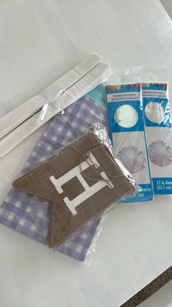 NEW Party Supplies Happy Birthday Flag Banner • Table Cover Lavender White Rectangle • Four White Pink Hanging Decoration Flower Ornaments Set$20Las Vegas, NV