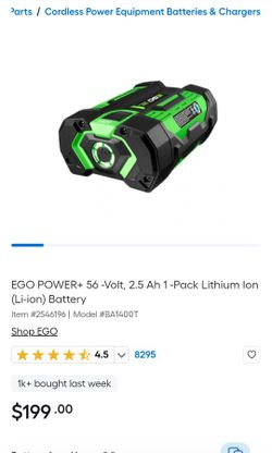 EGO POWER+ 56 -Volt, 2.5 Ah 1 -Pack Lithium Ion (Li-ion) Battery$180Merced, CA