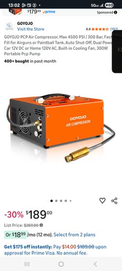 GOYOJO PCP Air Compressor, Max 4500 PSI / 300 Bar, Fast Fill for Airguns or Paintball Tank, Auto Shut-Off, Dual Power Car 12V DC or Home 120V AC, Buil$100Phoenix, AZ