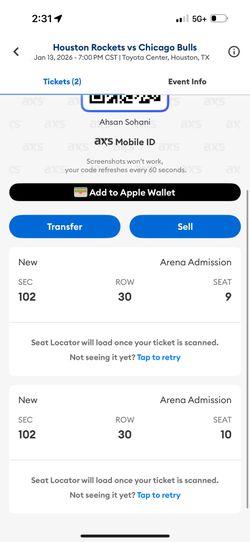 Rockets Tickets$75Sugar Land, TX