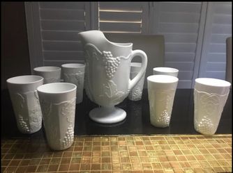 Vintage Indiana milk glass Colony Harvest grape pitcher and 8 tumblers$75San Antonio, TX