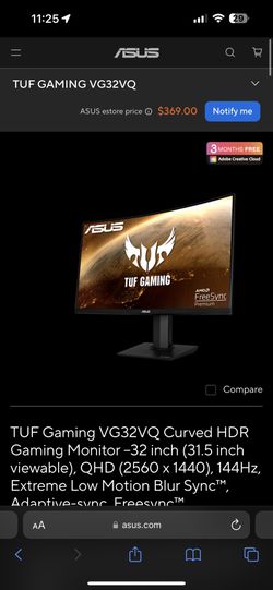 Asus 32" 2K Curved QHD 1ms 144Hz Monitor$220Beaverton, OR