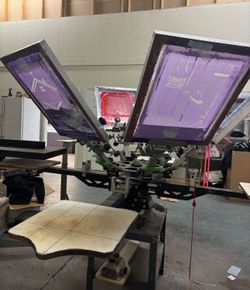 RILEY HOPKINS 250 6 COLOR 4 STATION SCREEN PRINTING PRESS WITH XY MICRO REGISTRATION Comes with 4 adult pallets 2 youth pallet 1 sleeve pallet $2,000North Highlands, CA