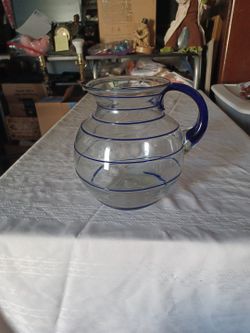 Vtg. Extra Large Mexican Hand-Blownswirl Novica Pitcher Cobalt Blue Rim And Blue Handle$35Taylor, TX