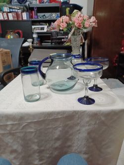 Mexican Handblown Bola Pitcher And Glasses Blue Rim$130Taylor, TX