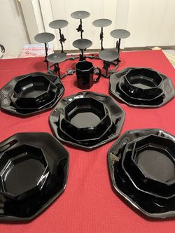 Black dishes set with plates, bowls, mug + black 2 tier multi candle holder$20Huntington Beach, CA
