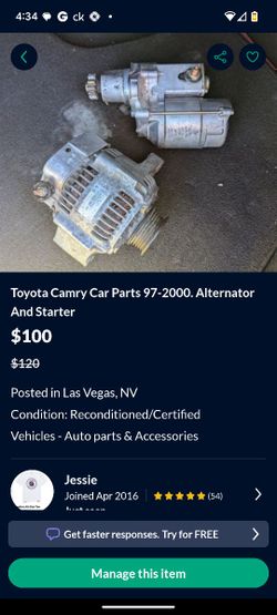 Toyota Camry Car Parts 97-2000. Alternator And Starter$100Las Vegas, NV