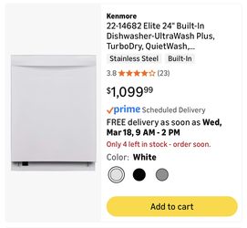 Kenmore Elite 24" Built-In Dishwasher - UltraWash Plus, TurboDry, QuietWash, SmartWash, TurboFlex Third Rack & Reach-Thru Handle - 15 Place Settings -$700Phoenix, AZ