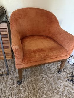 RARE VINTAGE designer Martin Brattrud Orange Crushed Velvet 1970 Russet Armchair Rolling Wheels mod style teak wood rolling chair 24” width Height $300San Diego, CA