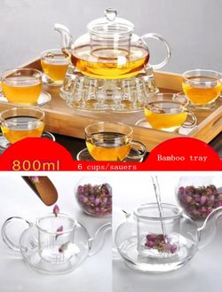 15pcs tea set: 800ml glass teapot (27oz)x1 2.1oz small cups x6 small saucers x6 crystal "heavy duty" base warmer (tea candle not included) x1 1 bamboo$29Piedmont, CA