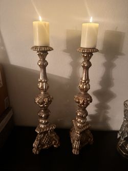 Pair Of Stunning And Ornate Pillar Gilt Wood/Wooden Rustic Baroque Style Matching Floor Or Desk/Table Candle/Candlestick Holders$165West Los Angeles, CA