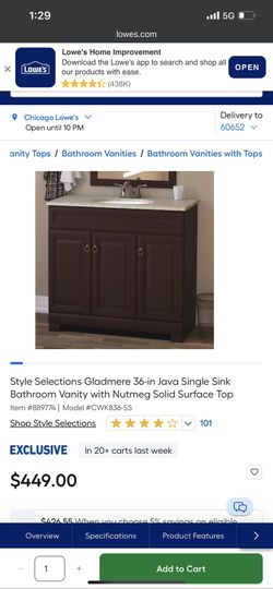 Style Selections Gladmere 36-in Java Single Sink Bathroom Vanity with Nutmeg Solid Surface Top$375Chicago, IL