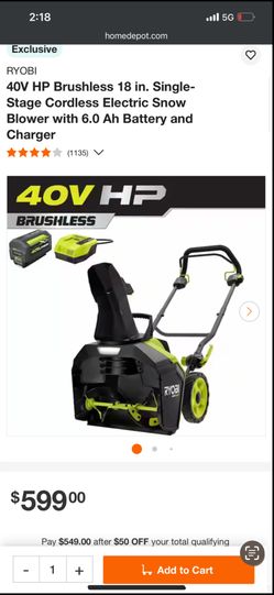40V HP Brushless 18 in. Single-Stage Cordless Electric Snow Blower with 6.0 Ah Battery and Charger$400Chicago, IL