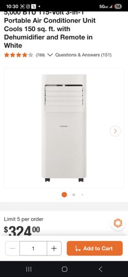 5,000 BTU 115-Volt 3-in-1 Portable Air Conditioner Unit Cools 150 sq. ft. with Dehumidifier and Remote in White$125Phoenix, AZ