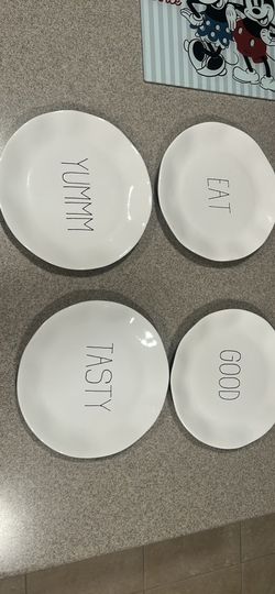 4-piece set of white ceramic plates from the Parini Cookware line, featuring the words "YUMMM", "EAT$40Chula Vista, CA