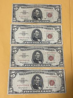 Four five-dollar bills from the 1963 red collection, I'm asking $20 each, firm price, they are in good condition.$20Glendale, AZ