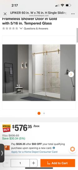 60 in. W x 76 in. H Single Sliding Frameless Shower Door in Gold with 5/16 in. Tempered Glass #210 Approximate Max Installed Width (in.) 61.42 in. Do$699Irvine, CA