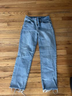 High-waisted blue denim jeans with frayed hem. Size zero$10Holbrook, NY