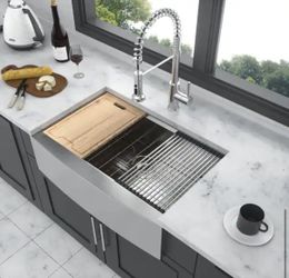 NEW STAINLESS 33 in. L X 21 in. W Farmhouse/Apron-Front Brushed Nickel Single Bowl 18-Gauge Stainless Steel Kitchen Sink w/Accessory$220Arcadia, CA